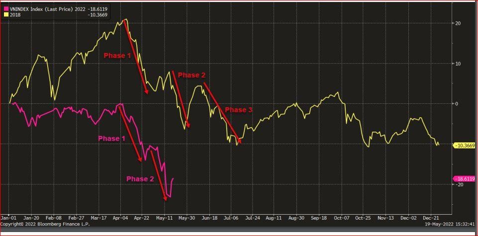 Vẽ lại biểu đồ biến động của VN - Index năm 2018, ông Hoàng Công Tuấn, Kinh tế trưởng MBS cho rằng, các đợt sụt giảm năm 2022 mang bóng dáng tương đồng với năm 2018. Các chuyên gia này cũng đề cập đến việc nhà đầu tư nước ngoài bán ròng thông qua khớp lệnh trên sàn, tương tự trong bối cảnh thị trường giảm trước đây.