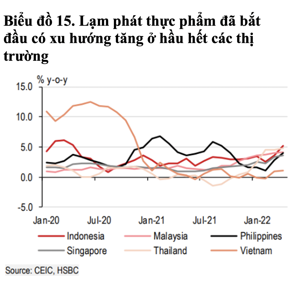 Bộ phận Nghiên cứu Toàn cầu HSBC vừa công bố báo cáo đánh giá tình hình lạm phát tại Việt Nam và các nước khác trong ASEAN với tựa đề “Rủi ro lạm phát lớn tới đâu”.