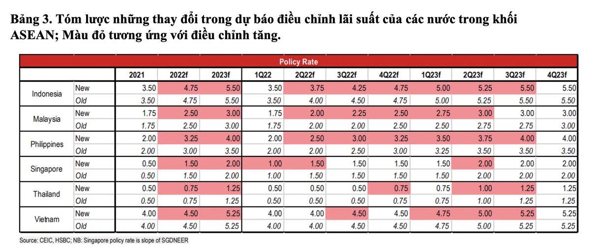 "Tình hình đó có thể sẽ khiến NHNN phải điều chỉnh lãi suất thêm 50 điểm cơ bản trong quý III/2022 trước khi tăng lãi suất ba lần mỗi lần 25 điểm cơ bản trong năm 2023", Báo cáo của HSBC dự báo.