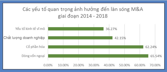 65,54% ý kiến cho rằng, dòng vốn ngoại cho hoạt động M&A được đánh giá là yếu tố quan trọng nhất quyết định thành công của làn sóng thứ hai. Điều này được lý giải bởi đây được coi là nguồn lực để có thể mua lại số cổ phần của các doanh nghiệp được Nhà nước bán ra trong giai đoạn 2014 - 2018, với những doanh nghiệp quy mô lớn.