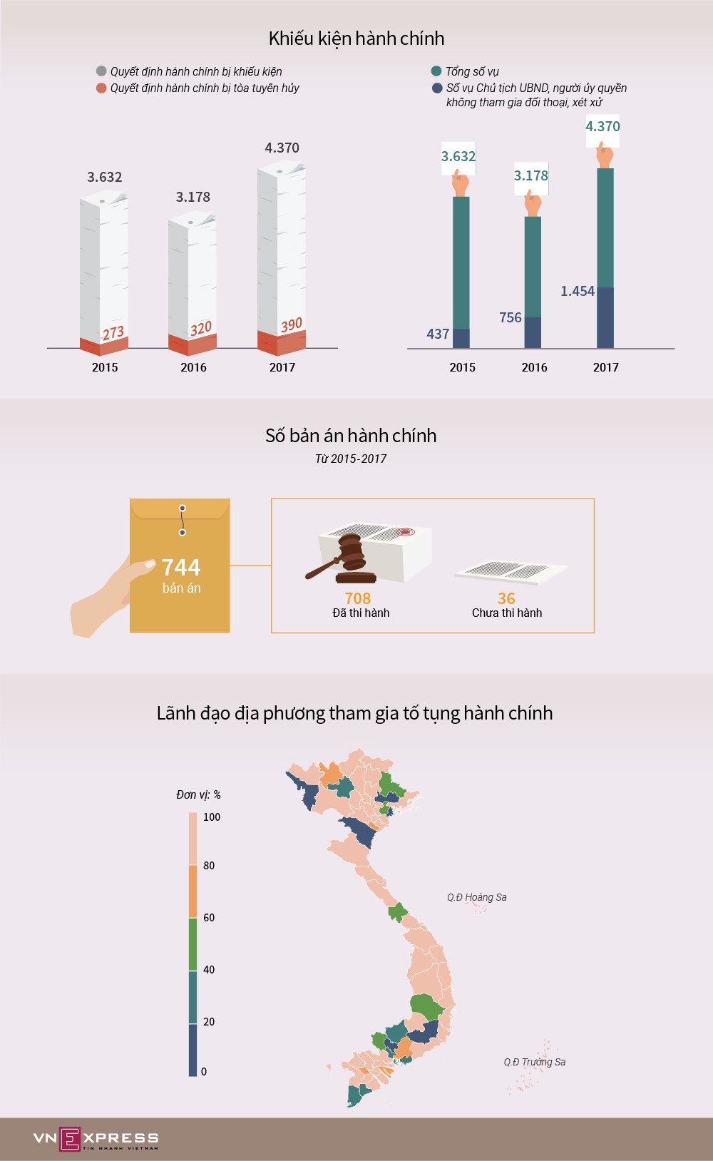 Theo báo cáo giám sát của Uỷ ban Tư pháp, trong năm 2017, cả nước có hơn 4.300 quyết định, hành vi hành chính của chủ tịch UBND bị khiếu kiện và 30% số đó không có sự tham gia của lãnh đạo liên quan.