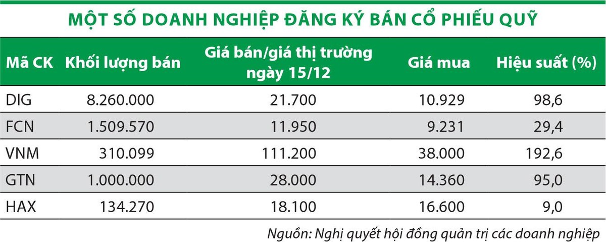 Nhiều doanh nghiệp khác dự kiến sẽ ghi nhận thặng dư vốn từ chênh lệch do mua bán cổ phiếu quỹ. Chẳng hạn, Công ty cổ phần FECON (FCN) đã thông qua nghị quyết bán ra 1,5 triệu cổ phiếu, trong khi giá thị trường ngày 15/12 cao hơn 29,4% so với giá mua cổ phiếu quỹ trung bình. Đây là lượng cổ phiếu quỹ mà doanh nghiệp mua nhằm bình ổn giá trong tháng 5/2020.