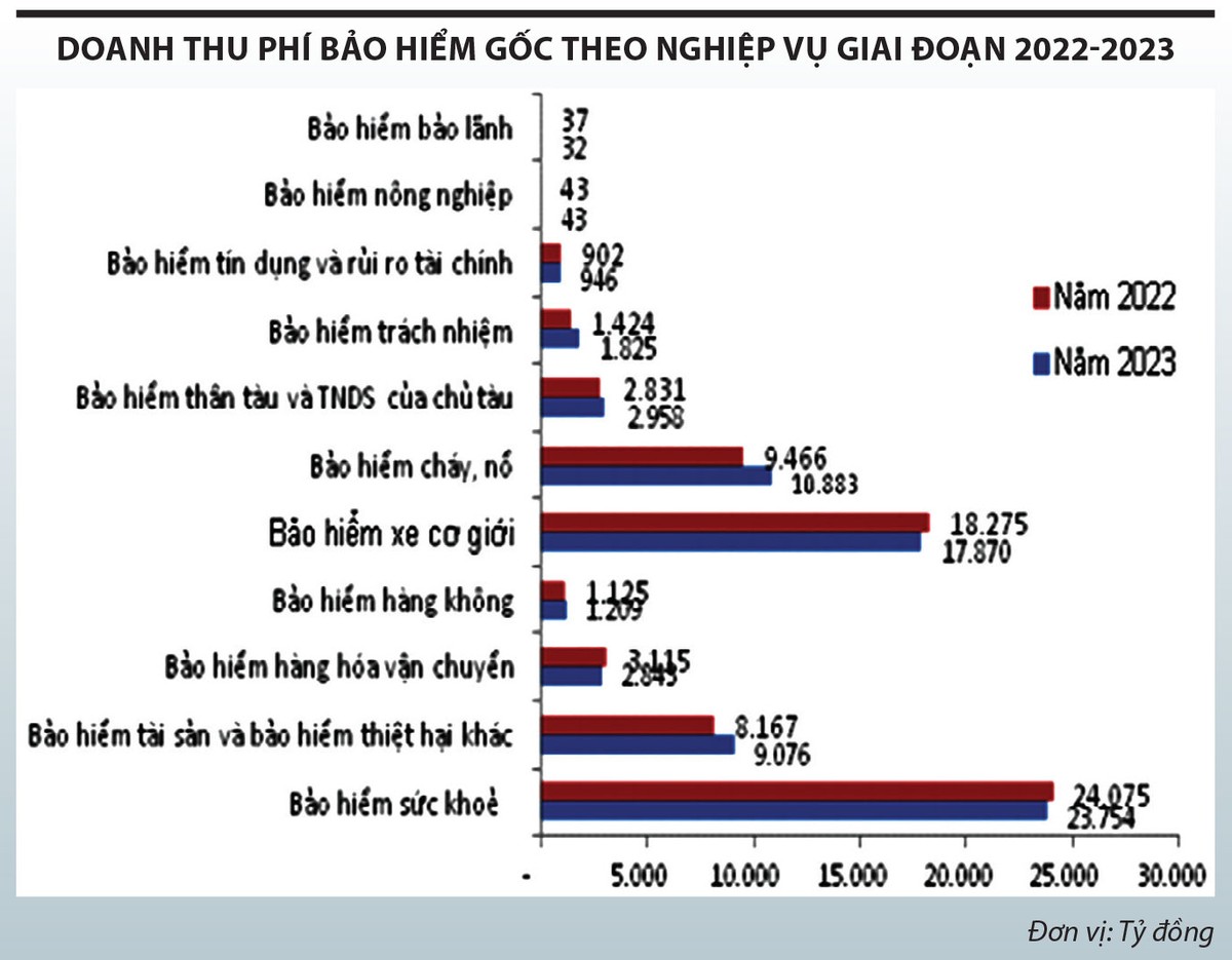 Theo Niên giám Bảo hiểm Việt Nam (Bộ Tài chính), năm 2023, nghiệp vụ bảo hiểm sức khoẻ chiếm tỷ trọng lớn nhất (33,25%) trong tổng doanh thu phí bảo hiểm gốc toàn thị trường, tiếp đến là bảo hiểm xe cơ giới (25,01%), bảo hiểm cháy nổ (15,23%), bảo hiểm tài sản (11,8%), bảo hiểm thân tàu và trách nhiệm dân sự chủ tàu (4,14%), bảo hiểm hàng hóa vận chuyển (3,98%), bảo hiểm trách nhiệm (2,55%), bảo hiểm hàng không (1,69%), bảo hiểm tín dụng và rủi ro tài chính (1,32%). Một số nghiệp vụ bảo hiểm vẫn chiếm tỷ trọng thấp như bảo hiểm thiệt hại khác (0,9%), bảo hiểm nông nghiệp (0,06%), bảo hiểm bảo lãnh (0,04%).