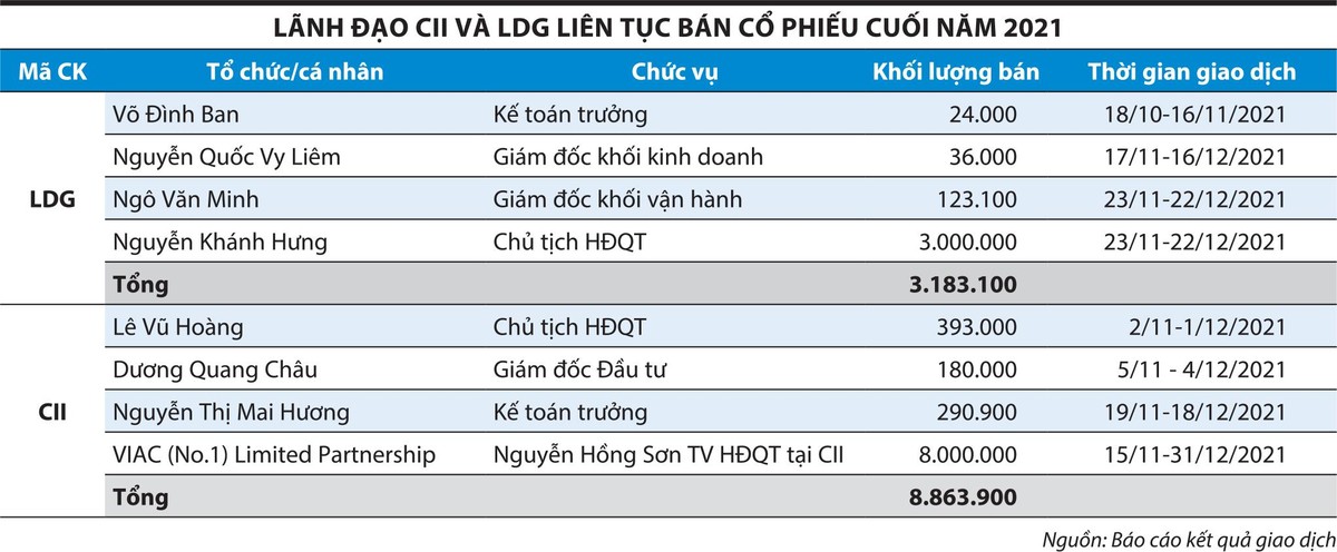 Có thể thấy, ban lãnh đạo của CII và LDG đều tận dụng sự bùng nổ của thị trường chứng khoán cuối năm 2021 chốt lời cổ phiếu ngay vùng đỉnh. Điều này không chỉ phát đi tín hiệu về sự thiếu gắn kết của ban lãnh đạo, khiến nhà đầu tư nghi ngờ về triển vọng của doanh nghiệp trong tương lai khi cổ đông nội bộ bán ra, mà thực tế đã ảnh hưởng đến hoạt động sản xuất - kinh doanh của các doanh nghiệp này.