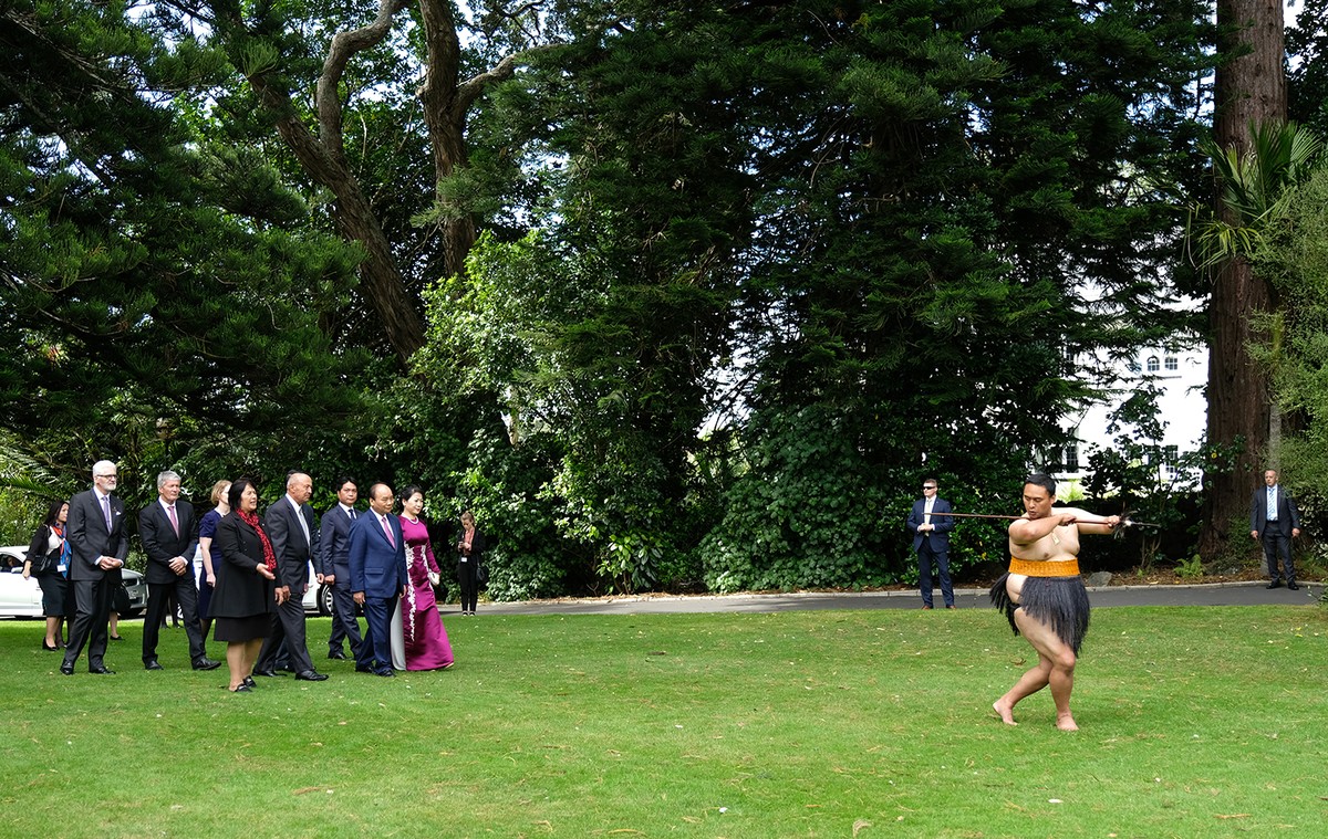 Thủ tướng New Zealand Jacinda Andern chủ trì lễ đón, được mở đầu bằng màn múa đón khách quý mang đậm nét văn hóa truyền thống của các chiến binh Maori.