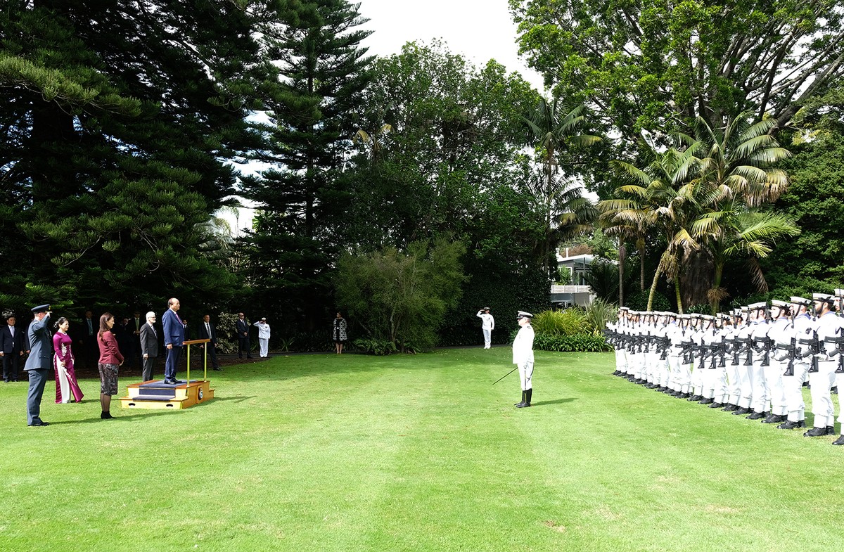 Tiếp đến, nghi lễ chào cờ được tiến hành trong tiếng quân nhạc cử quốc thiều của Việt Nam và cùng lúc, 19 phát đại bác được bắn tại Tòa nhà Chính phủ New Zealand, thể hiện nghi thức chào đón cao nhất dành cho người đứng đầu chính phủ.