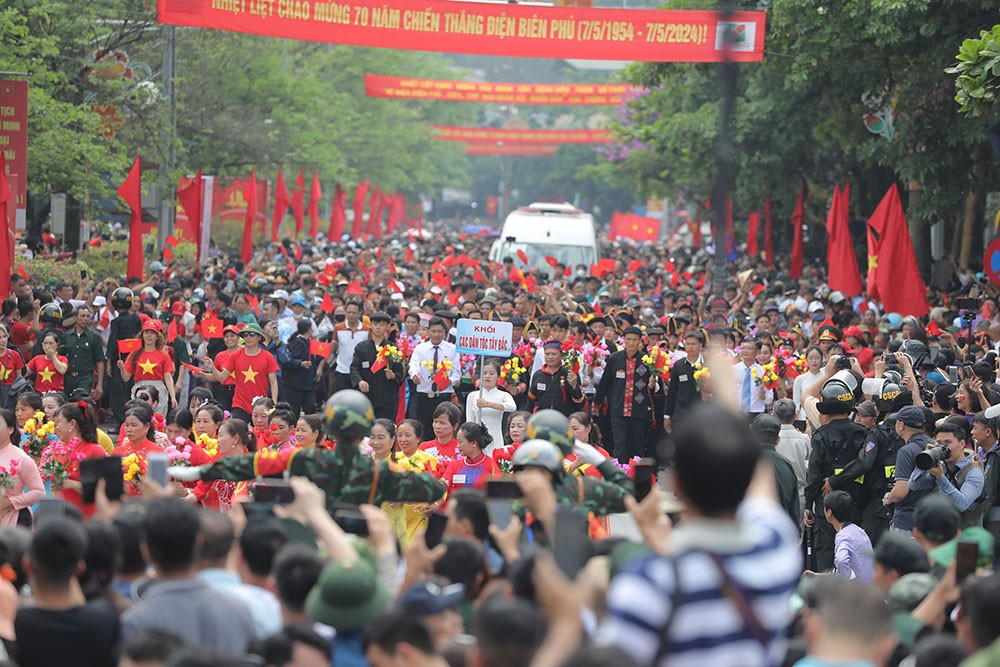 Đội hình diễu binh, diễu hành trong Lễ Kỷ niệm tái hiện khí thế hào hùng của Chiến thắng Điện Biên Phủ lừng lẫy năm châu, chấn động địa cầu.