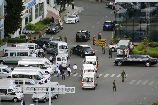 Đoàn xe rời khỏi Lãnh sự quán trên đường Lê Duẩn, Quận 1. Để đảm bảo an toàn, bao giờ cũng có 2 xe giống hệt nhau đón Tổng thống Mỹ.