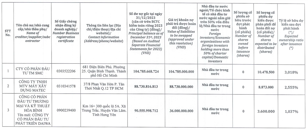 Danh sách chủ nợ đồng ý hoán đổi bao gồm 99 công ty trong nước với tổng số nợ là 1.116,4 tỷ đồng và số nợ đồng ý hoán đổi lấy cổ phiếu là 730,8 tỷ đồng. Trong đó, doanh nghiệp đồng ý hoán đổi nợ nhiều nhất là CTCP Đầu tư Thương mại SMC (mã SMC – sàn HOSE), đơn vị này sẽ hoán đổi 104,8 tỷ đồng, tỷ lệ sở hữu tại Xây dựng Hòa Bình dự kiến sau đợt phát hành là 3,018% vốn điều lệ.