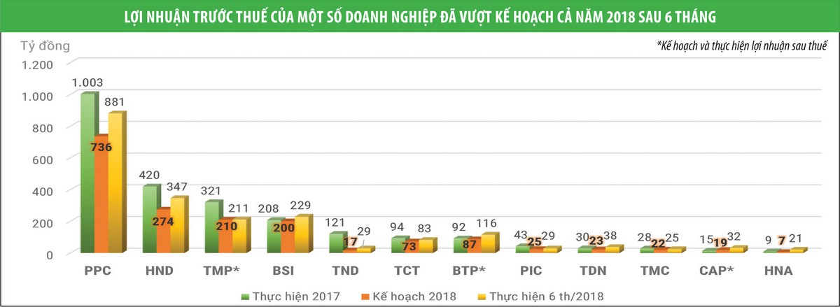 Hoàn thành kế hoạch lợi nhuận cũng là câu chuyện của CTCP Nông sản thực phẩm Yên Bái (CAP), CTCP Đầu tư điện lực 3 (PIC), CTCP Cáp treo Núi Bà Tây Ninh (TCT), CTCP Thủy điện Thác Mơ (TMP), CTCP Nhiệt điện Hải Phòng (HND)… ngay trong quý II/2018.