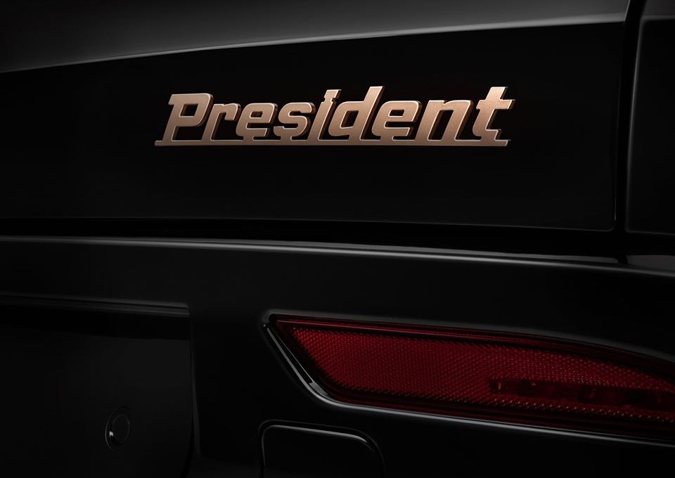 Tuy nhiên bản President đã được tinh chỉnh lại một số chi tiết quan trọng như phần nắp ca-pô với hốc hút gió nằm chính giữa giống các mẫu xe thể thao hiệu suất cao, phần logo, cản dưới, ốp trang trí, mâm xe, viền cửa sổ và giá nóc đều được sơn màu vàng đồng tương phải với màu sơn nâu/đen ở ngoại thất.