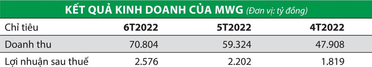 Trong 6 tháng đầu năm 2022, Công ty cổ phần Đầu tư Thế giới Di động (mã chứng khoán MWG) đạt tổng doanh thu 70.804 tỷ đồng, tăng 13% so với cùng kỳ năm 2021 và hoàn thành 51% kế hoạch năm; lợi nhuận sau thuế 2.576 tỷ đồng, tăng 1% so với cùng kỳ năm 2021 và hoàn thành 41% kế hoạch năm.