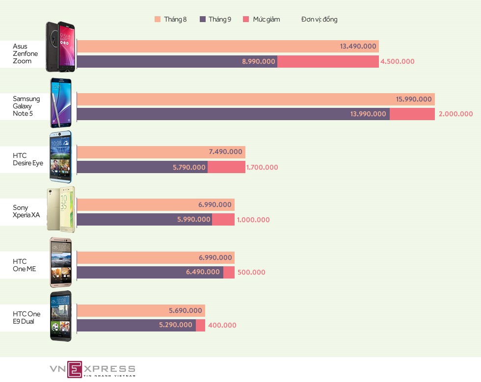 Biểu đồ so sánh mức giảm của các mẫu điện thoại tiêu biểu trong tháng 8. Bấm vào để xem hình lớn