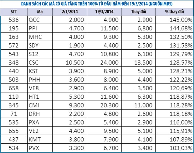 Theo thống kê sơ bộ của ĐTCK đối với cả hai sàn chứng khoán, từ 1/2/2014 đến 19/3/2014, có hơn 150 mã có mức tăng từ 30 - 50%, hơn 100 mã có mức tăng 50 - 80%, 24 mã tăng từ 80 - 100% và 16 mã tăng trên 100%.