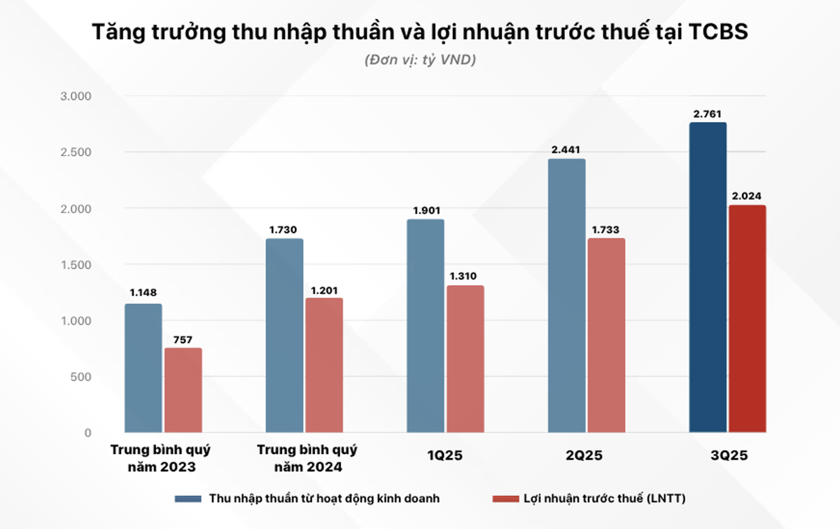 Lợi nhuận trước thuế quý III/2025 của TCBS tiếp tục tăng trưởng bứt phá kỷ lục, đạt 2.024 tỷ đồng, tăng trưởng 85% so với cùng kỳ năm ngoái. Lũy kế 9 tháng đầu năm 2025, lợi nhuận trước thuế của Công ty đạt 5.067 tỷ đồng, tăng 31% so với cùng kỳ 2024 và đạt gần 90% kế hoạch cả năm 2025.