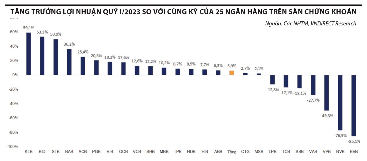 Thống kê của Khối Phân tích, Công ty Chứng khoán VNDIRECT cho thấy, quý I/2023, tăng trưởng trung bình lợi nhuận trước thuế của 25 ngân hàng trên sàn chứng khoán đạt xấp xỉ 6%, chậm lại đáng kể so với mức tăng xấp xỉ 30% của cùng kỳ.