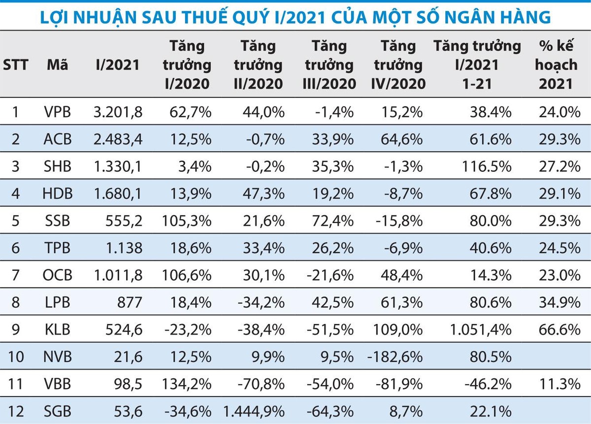 Thống kê Công ty Chứng khoán VNDirect thực hiện với các ngân hàng đã công bố báo cáo tài chính quý I/2021, mức tăng trưởng lợi nhuận của cả ngành đạt 69% so với cùng kỳ, cao hơn nhiều so với con số tăng trưởng 22% của quý I/2020.