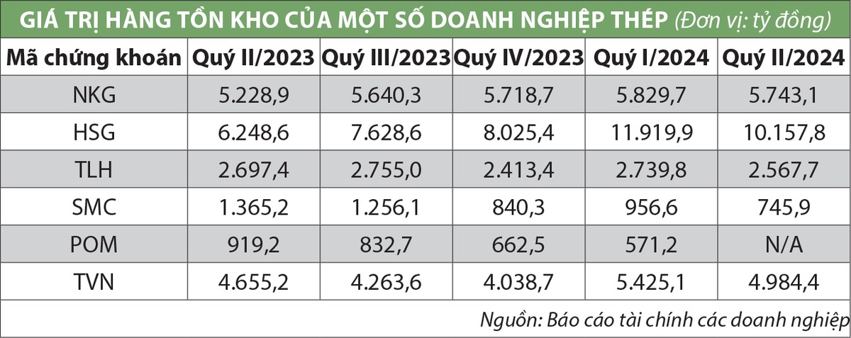 Với Thép Nam Kim và Thép Tiến Lên, giá trị hàng tồn kho trong nửa đầu năm 2024 tăng nhẹ. Giá thép giảm trong quý II nên hai đơn vị này đã thực hiện giảm hàng tồn kho, trong khi tồn kho trong quý I tăng không nhiều, nên tính đến cuối quý II/2024, giá trị hàng tồn kho biến động không đáng kể.