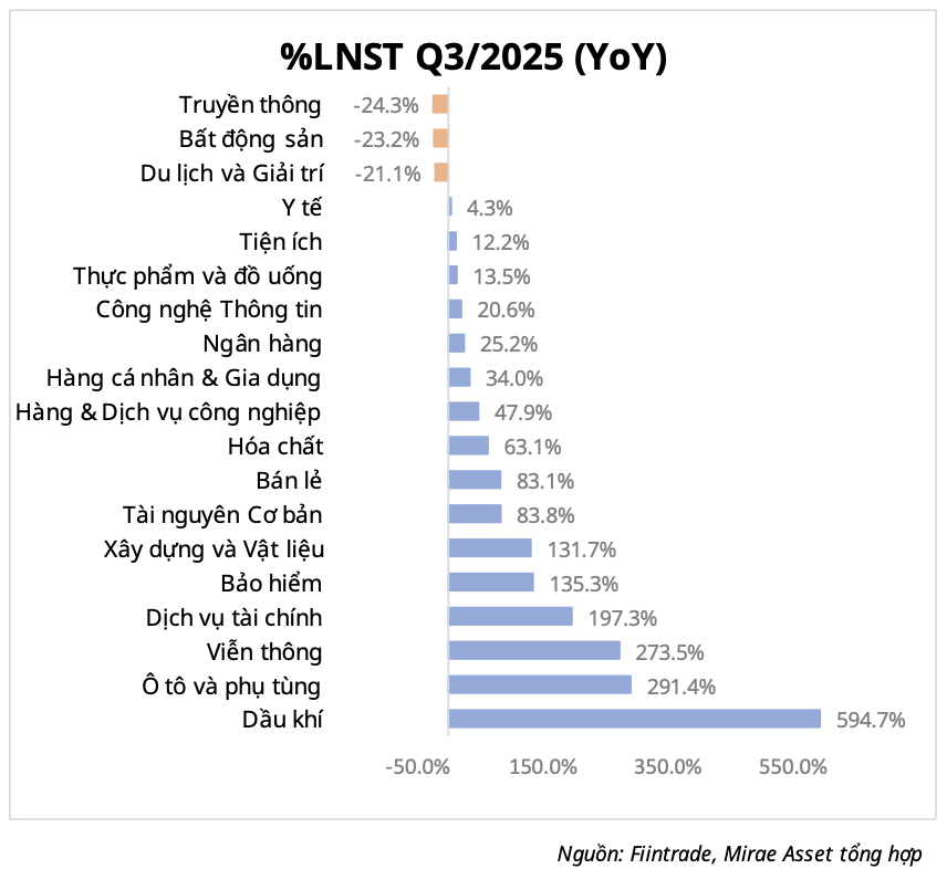 Trong báo cáo mới phát hành, Mirae Asser đánh giá, bức tranh kết quả kinh doanh quý III/2025 tính đến ngày 31/10 cho thấy sự tăng trưởng vượt trội so với cùng kỳ, đồng thời thể hiện rõ sự phân hóa giữa các nhóm ngành. Dù số lượng ngành có lợi nhuận sau thuế tăng trưởng dương ít hơn so với quý II/2025, nhưng tốc độ tăng trưởng tổng lợi nhuận sau thuế toàn thị trường lại đạt mức cao nhất trong nhiều quý gần đây.