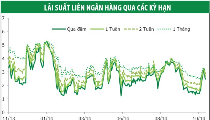 Thị trường lãi suất liên ngân hàng có xu hướng tăng trong vài phiên đầu tuần, tuy nhiên lại giảm nhẹ khoảng 30 - 50 điểm trong những ngày cuối tuần. Theo thông tin tại một số ngân hàng, nhu cầu vay vốn ngắn hạn tăng trong thời điểm đầu tuần là nguyên nhân chính dẫn đến việc lãi suất tăng. Lãi suất qua đêm đạt 3,2% ngày 15/10. Tuy nhiên, mặt bằng lãi suất liên ngân hàng ở những kỳ hạn ngắn hạ nhiệt dần về cuối tuần. Lãi suất tham khảo ở mức: qua đêm (2,5%, +40 điểm), 1 tuần (2,7%, +40 điểm), 2 tuần (2,9%, +30 điểm), 1 tháng (3,1%, +30 điểm).