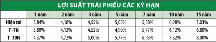 Theo số liệu từ Bloomberg, lợi suất bắt đầu tăng dần trên hầu hết các kỳ hạn ngoại trừ kỳ hạn 7 năm. Xu hướng tăng của lợi suất nhanh hơn tại các kỳ hạn dài và chậm ở các kỳ hạn ngắn. Trái phiếu 1, 2 và 3 năm tăng lần lượt 4, 5 và 3 điểm cơ bản, lên mức lợi suất 3,84%/năm, 4,18%/năm và 4,55%/năm. Lợi suất trái phiếu 5, 10 và 15 năm ghi nhận lần lượt tại 5,05%/năm (+15 điểm cơ bản), 6,28%/năm (+16 điểm cơ bản) và 7,03%/năm (+23 điểm cơ bản). Kỳ hạn 7 năm tiếp tục giảm 19 điểm cơ bản, về mức lợi suất 5,58%/năm.