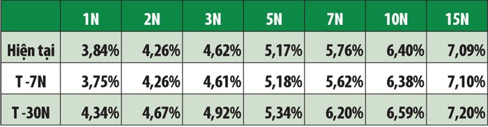 Theo số liệu từ Bloomberg, lợi suất phân hoá theo các kỳ hạn còn lại khác nhau, tuy nhiên, mức độ tăng/giảm không đáng kể. Duy chỉ có trái phiếu kỳ hạn 7 năm tăng 14 điểm cơ bản, lên mức 5,76%/năm. Trái phiếu 1, 2, 3, 5, 10 và 15 năm ghi nhận lần lượt tại 3,84%/năm (+9 điểm cơ bản), 4,26%/năm (không thay đổi), 4,62% (+1 điểm cơ bản), 5,17% (-1 điểm cơ bản), 6,40%/năm (+ 2 điểm cơ bản) và 7,09%/năm (- 1 điểm cơ bản).