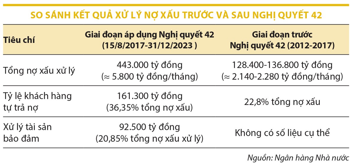 Trên thực tế, Nghị quyết 42 đã giúp cải thiện đáng kể tốc độ và hiệu quả xử lý nợ trong toàn hệ thống. Giai đoạn 2017-2023, các TCTD xử lý được khoảng 443.800 tỷ đồng nợ xấu (không bao gồm phần xử lý bằng dự phòng), tương đương 5.800 tỷ đồng/tháng, cao gấp 2,5 lần so với giai đoạn 2012-2017. Tỷ lệ khách hàng tự trả nợ cũng tăng từ 22,8% lên 36,4%, phản ánh xu hướng xử lý bền vững hơn.