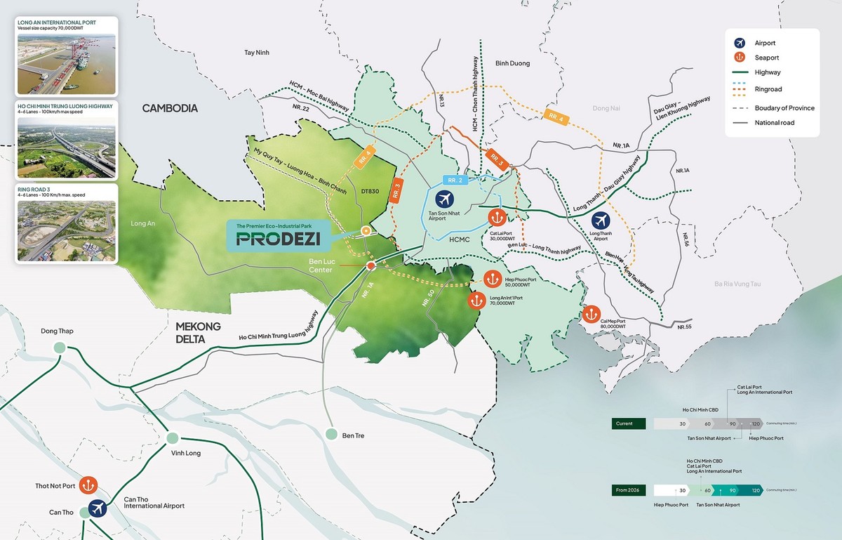 Nét chấm phá đáng chú ý khi nhắc đến phát triển kinh tế Long An là sự ra đời của các KCN sinh thái (EIP), điển hình là KCN Prodezi. Có quy mô lên tới 400 ha, vốn đầu tư 4.600 tỷ đồng, Prodezi là KCN sinh thái đầu tiên của Long An và là một trong những KCN lớn bậc nhất tại ĐBSCL. Sở hữu vị trí chiến lược tại giao điểm giữa đường tỉnh 830 hiện hữu và Đại lộ Lương Hòa - Bình Chánh (lộ giới 60 m), chỉ mất khoảng 5 phút để kết nối từ Prodezi đến TP.HCM cũng như dễ dàng tiếp cận các tuyến đường trọng yếu, sân bay và cảng biển.