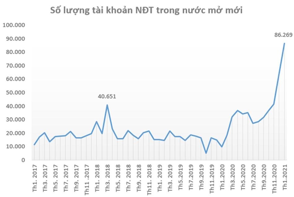 Nếu so với hồi tháng 3/2018 khi số lượng tài khoản mở mới đạt 40.651 tài khoản thì tháng 1/2021 đã thiết lập kỷ lục mới với số lượng tài khoản mở mới tăng gấp đôi so với mức đỉnh cũ là 86.269 tài khoản.