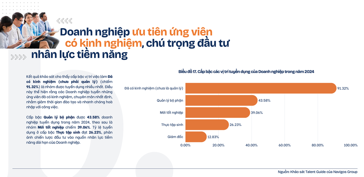 Cụ thể, các doanh nghiệp tiếp tục ưu tiên tuyển dụng nhân sự có kinh nghiệm từ 1 đến 3 năm (55,47%) và từ 3 đến 5 năm (27,36%). Các vị trí được tuyển nhiều nhất thuộc lĩnh vực Kinh doanh/Bán hàng (59,43%), Sản xuất (33,02%) và Dịch vụ khách hàng (24,34%).
