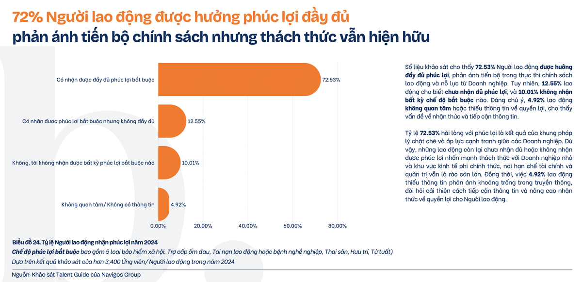 Bên cạnh tình hình thu nhập, khoảng 72,53% người lao động được hưởng đầy đủ các chế độ phúc lợi bắt buộc. Tuy nhiên, vẫn còn 12,55% chưa nhận đủ các phúc lợi cần thiết và 10,01% không được hưởng bất kỳ chế độ phúc lợi bắt buộc nào.