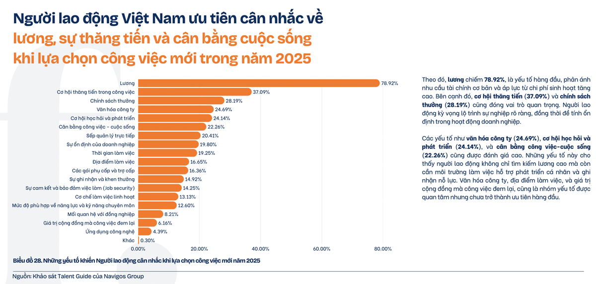 Sang năm 2025, người lao động ưu tiên lương (78,92%), cơ hội thăng tiến (37,09%) và chính sách thưởng (28,19%), cho thấy nhu cầu không chỉ về thu nhập mà còn về lộ trình phát triển rõ ràng.