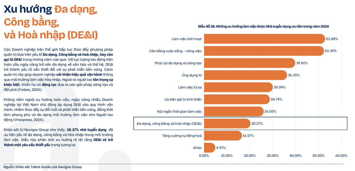 Báo cáo ghi nhận sự gia tăng mạnh mẽ của xu hướng Đa dạng, Công bằng và Hòa nhập (DE&I) trong doanh nghiệp. Cụ thể, 20,27% nhà tuyển dụng đã ưu tiên phát triển yếu tố này nhằm tạo ra môi trường làm việc đa dạng, đảm bảo cơ hội công bằng cho mọi nhân viên. Xu hướng này không chỉ góp phần nâng cao tinh thần làm việc mà còn đóng vai trò quan trọng trong việc giữ chân nhân tài.