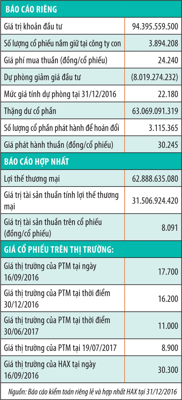 Trong trường hợp HAX phát hành cổ phiếu để hoán đổi cổ phần PTM theo tỷ lệ 10:8, giá trị đầu tư theo giá hợp lý được ghi nhận là giá đóng cửa của cổ phiếu HAX tại ngày hợp nhất. Với mức giá mua này, HAX đã phát sinh một khoản lợi thế thương mại rất lớn, do giá trị tài sản thuần của PTM chỉ có khoảng 8.000 đồng/cổ phiếu.