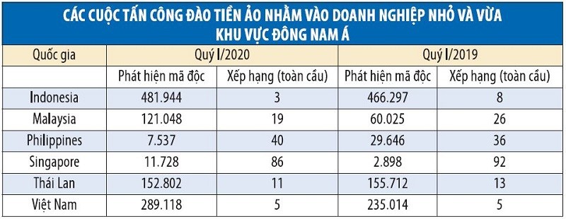 Báo cáo mới nhất của Kaspersky cũng cho thấy, chỉ trong nửa đầu năm 2020, đã có hơn 500.000 cuộc tấn công vào máy tính của doanh nghiệp nhỏ và vừa tại khu vực Đông Nam Á. Đặc biệt, Việt Nam đứng thứ 8 trong các quốc gia có số vụ tấn công bằng mã độc nhiều nhất thế giới.