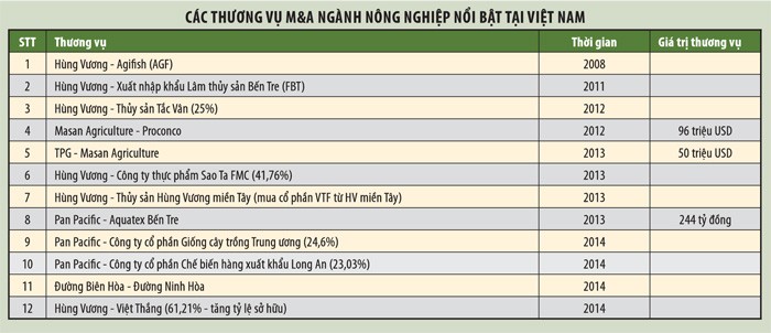 Các công ty, tập đoàn có sự quan tâm lớn tới ngành nông nghiệp bằng việc mua lại các doanh nghiệp lớn trong ngành như Masan mua cổ phần của Công ty cổ phần Thức ăn gia súc Việt Pháp (Proconco); PAN Pacific mua lại các công ty trong ngành nông nghiệp, thủy sản; Thủy sản Hùng Vương khép kín chuỗi sản xuất; hay gần đây là thương vụ giữa Đường Ninh Hòa và Đường Biên Hòa. Tất cả đã thực sự chứng minh sự sôi động của hoạt động M&A trong ngành nông nghiệp.
