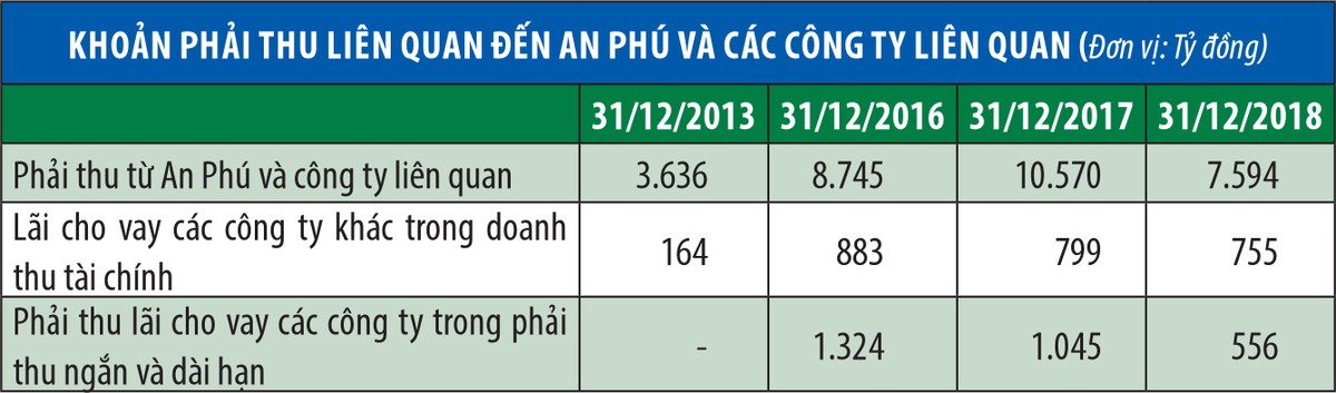 Tại thời điểm cuối 2013, báo cáo tài chính của HAG cho biết, Công ty có 3.636 tỷ đồng phải thu dài hạn với An Phú. Đây là khoản vay xuất hiện trong thời gian tái cấu trúc tháng 10/2013 với mục đích "hỗ trợ tài chính cho An Phú trong việc mua lại các công ty con và các dự án của Tập đoàn", thời gian dự kiến là 3 năm, lãi suất là 13%/năm.