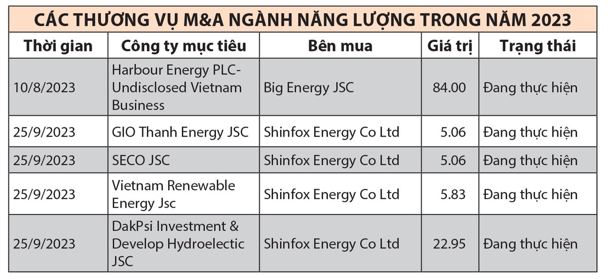 Đối với ngành năng lượng, theo thống kê của Công ty Chứng khoán DSC, tổng giá trị các thương vụ đạt 758 triệu USD trong năm 2022. Năm 2023, M&A ngành năng lượng tương đối trầm lắng, một phần do kinh tế thế giới ảm đạm, ảnh hưởng tới dòng vốn của nhà đầu tư nước ngoài vào Việt Nam; một phần do nhiều doanh nghiệp năng lượng trong nước sử dụng đòn bẩy tài chính cao gặp khó khăn khi thị trường trái phiếu bị “hãm phanh”. Tuy nhiên, về dài hạn, xu hướng chuyển đổi sang năng lượng tái tạo sẽ là động lực lớn cho hoạt động M&A trong ngành năng lượng.