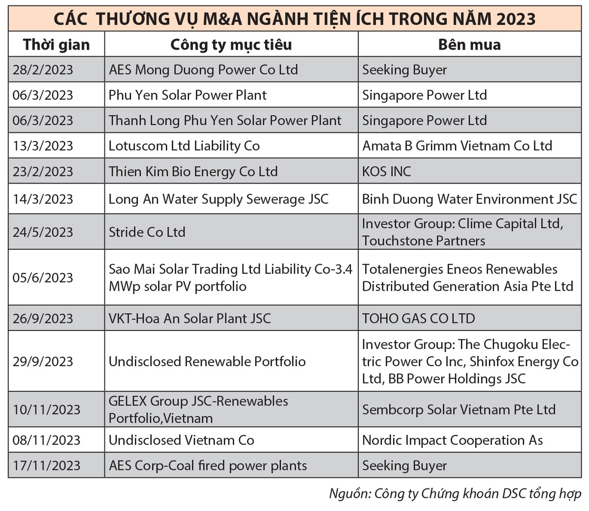 Đối với ngành tiện ích, hoạt động M&A diễn ra khá sôi nổi, đặc biệt là trong ngành nước, do tiềm năng phát triển lớn của ngành. Ngành tiện ích Việt Nam cũng thu hút sự quan tâm của các nhà đầu tư nước ngoài, đến từ Singapore, Nhật Bản… Đối với các doanh nghiệp trong nước, Công ty cổ phần Nước và Môi trường Bình Dương (Biwase) có lẽ là bên hoạt động mạnh nhất trong năm 2023 khi đã thâu tóm, hoặc lên kế hoạch thâu tóm hàng loạt công ty con như Nước Long An, Cần Giuộc, Cần Đước, Châu Thành…