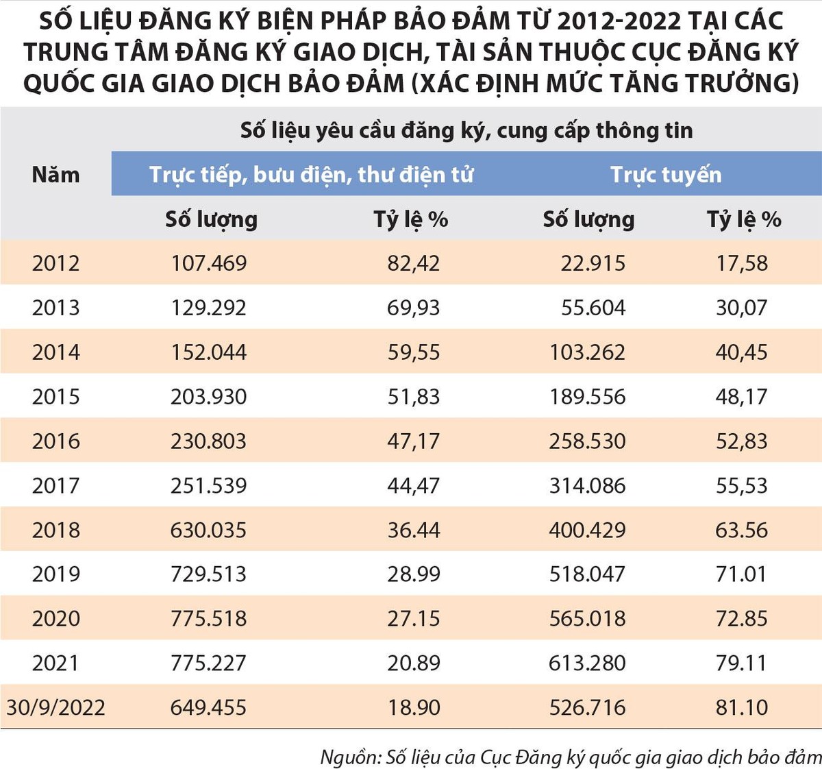 Lượng yêu cầu đăng ký trực tuyến ngày càng tăng (tính đến thời điểm ngày 30/9/2022 đạt mức trung bình 81,1% lượng yêu cầu đăng ký), việc trả kết quả đăng ký trực tuyến được thực hiện ngay sau khi nhận được hồ sơ đăng ký hợp lệ. Hệ thống đăng ký này cũng đã có cơ sở dữ liệu riêng, cập nhật thường xuyên, kịp thời, đáp ứng được nhu cầu tra cứu thông tin trực tuyến về tài sản bảo đảm. Bên cạnh đó, các dịch vụ công về ĐKBPBĐ bằng động sản đã được Bộ Tư pháp tích hợp thành công và chính thức đi vào hoạt động trên Cổng dịch vụ công quốc gia từ ngày 22/9/2022.