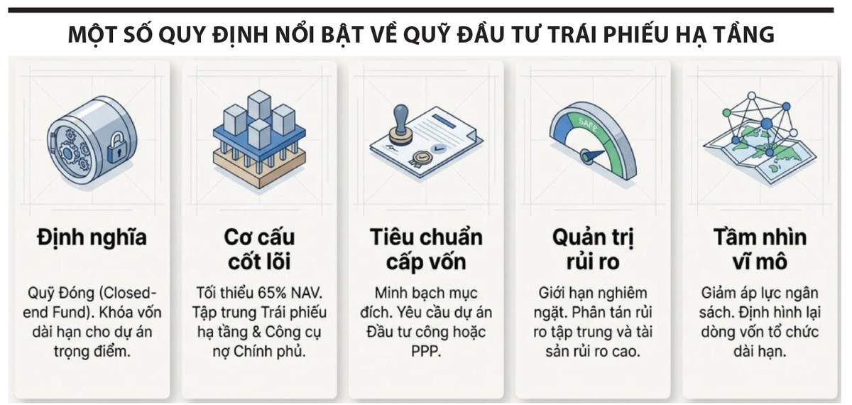 Thông tư cũng đặt ra các giới hạn đầu tư để tránh rủi ro tập trung. Quỹ phải duy trì tỷ trọng tối thiểu 65% ở nhóm tài sản mục tiêu; bị giới hạn tỷ lệ đầu tư vào một tổ chức phát hành; bị khống chế đầu tư vào nhóm công ty có liên hệ sở hữu; đồng thời phải thực hiện nghĩa vụ báo cáo, công bố thông tin và điều chỉnh cơ cấu đầu tư khi vượt ngưỡng. Chính cách thiết kế này làm cho quỹ trái phiếu hạ tầng có ý nghĩa thực chất hơn, bởi nó cho thấy nhà làm chính sách đang đi theo hướng phát triển thị trường bằng kỷ luật, chứ không phải bằng nới lỏng điều kiện.