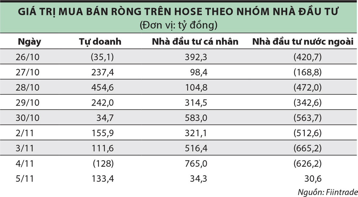 Theo Fiintrade, trong tháng 10/2020, khối nhà đầu tư cá nhân mua ròng 5.423 tỷ đồng, là trụ đỡ chính cho thị trường. Khối này chỉ bán ròng duy nhất một phiên. Các cổ phiếu thu hút dòng tiền là MSN, CTG, TCB, HPG, VIC, DIG, VNM, FLC… Xu hướng này chưa thay đổi trong tuần đầu tháng 11.