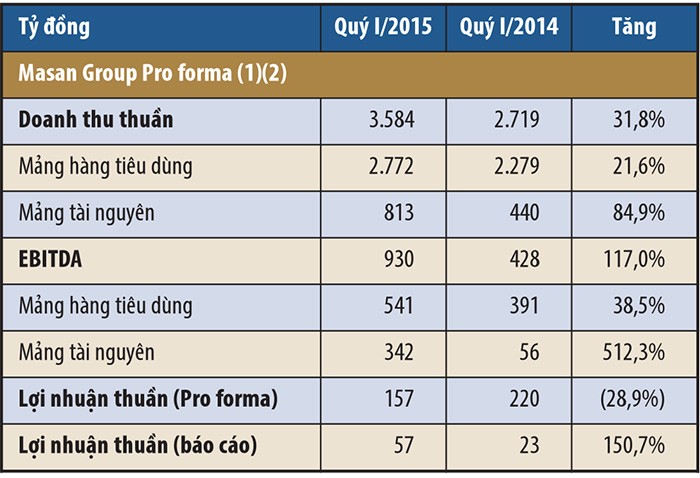| Theo báo cáo quý I/2015, Masan Group đạt doanh thu 3.584 tỷ đồng, tăng 31,8% so với quý I/2014. Doanh thu này phản ánh sự đóng góp của mỏ Núi Pháo cho cả quý I/2015 và tốc độ tăng trưởng hai con số từ mảng kinh doanh hàng tiêu dùng. Doanh thu từ Masan Nutri-Science chưa được phản ánh trong kết quả quý I/2015 vì việc mua lại Công ty được thực hiện vào cuối tháng 4/2015. |