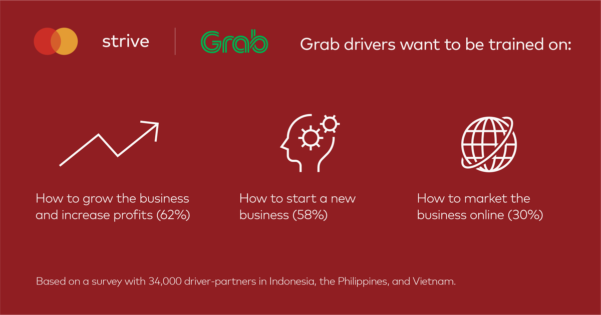 Ba chủ đề đào tạo mà các đối tác tài xế quan tâm nhất gồm: 1) cách phát triển kinh doanh và tăng lợi nhuận (64%); 2) cách khởi nghiệp (44%); và 3) cách tiếp thị kinh doanh trực tuyến (19%).