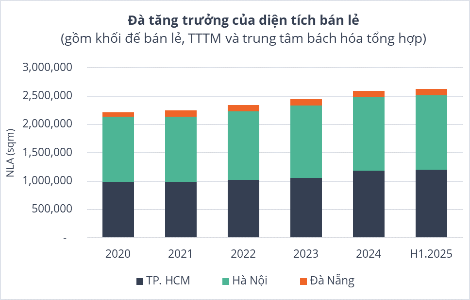 Số liệu bất động sản càng củng cố xu hướng này. Từ năm 2020 đến nửa đầu năm 2025, tổng diện tích cho thuê thực (NLA) của khối đế bán lẻ, TTTM và trung tâm bách hóa tổng hợp tại Hà Nội, Đà Nẵng và TP.HCM đã ghi nhận tốc độ tăng trưởng kép hàng năm (CAGR) đạt 3,13%, tương đương 2,6 triệu m2 tính đến hết quý II/2025. Trong các mô hình MT, cửa hàng tiện lợi là loại hình tăng trưởng nhanh nhất nhờ nhu cầu về tính thuận tiện và dễ tiếp cận.