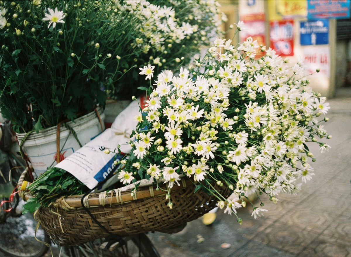 Tôi cố bấm còi xe vượt lên phía trước, cốt để ngắm nhìn màu của mùa Thu trong từng rổ đầy hoa. Cái rổ thưa, đã to khác thường, mà hoa còn tràn ra cả bốn phía.