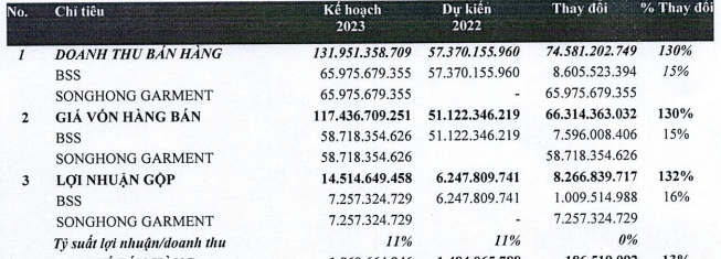 Giả định sau khi có sự tham gia của MSH, năm 2023, doanh thu từ các nguồn hiện tại của BSS Logistics tăng 15% so với năm 2022 (bằng với doanh thu từ các nguồn hiện tại của BSS dự kiến năm 2023). Tỷ suất lợi nhuận gộp/doanh thu dự kiến là 11% (có thể cao hơn nếu phát triển được phần sales agent phát lệnh). Tỷ suất lợi nhuận/vốn góp chủ đầu tư dự kiến là 56%.