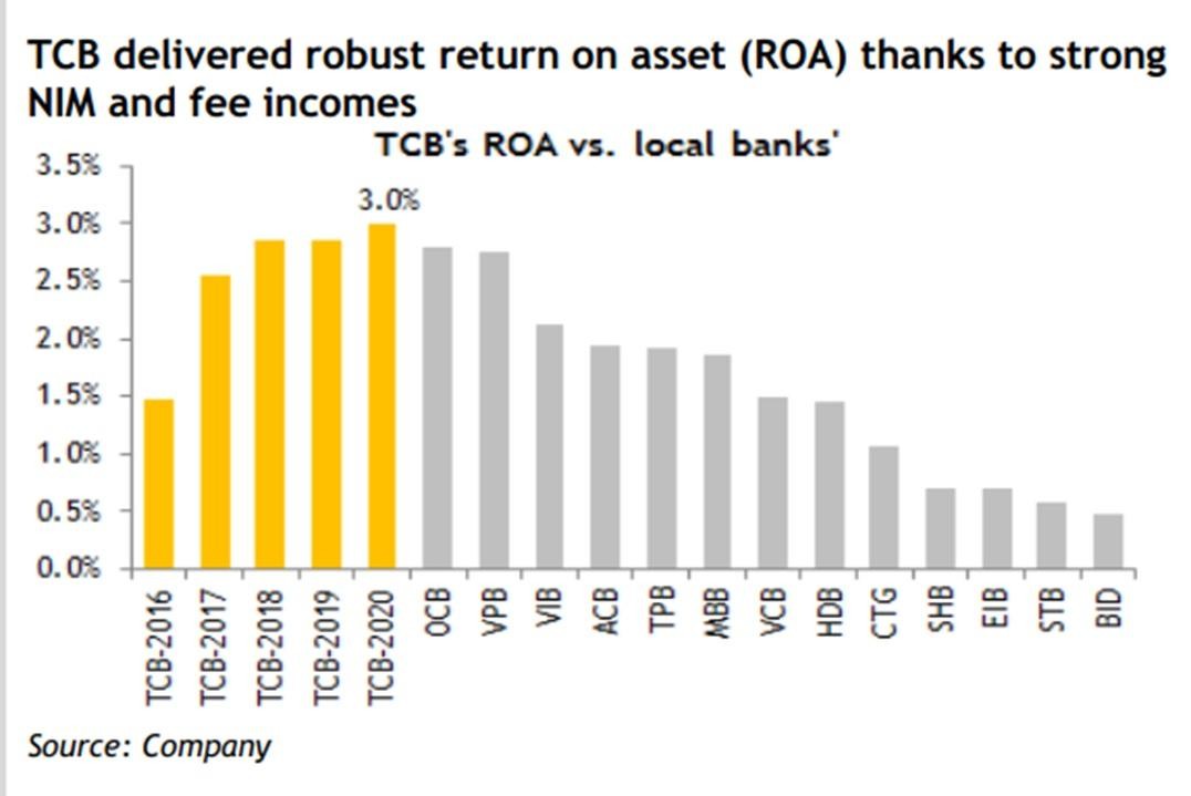 NIM của Techcombank đã đạt mức gần 6% trong quý 1 nhờ tỷ lệ CASA cao nhất ngành (đạt mức 44%). Dự báo giai đoạn 2021-2022, tăng trưởng lợi nhuận của Techcombank lần lượt đạt mức 26% và 22%. Theo đó, ROE dự báo đạt khoảng 19% (so với 18,1% năm 2020), nhờ vào bảng cân đối kế toán và tỷ lệ đòn bẩy lành mạnh (TA/TE dưới 6 lần).