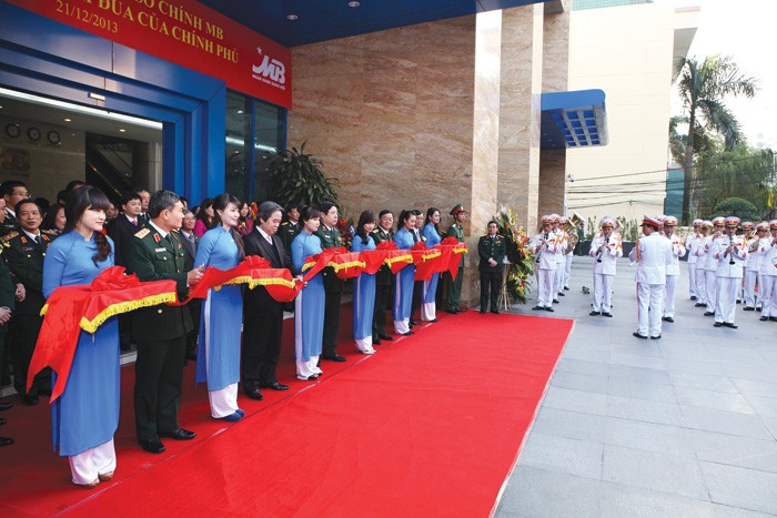 Lãnh đạo Bộ Quốc phòng, Ngân hàng Nhà nước cùng cắt băng khánh thành tòa nhà trụ sở của MB, tại Cát Linh, Hà Nội khi MB tròn 19 tuổi