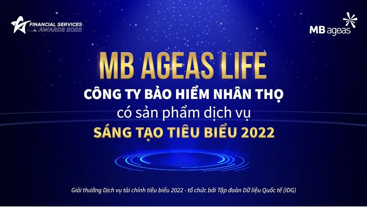 Là đơn vị tiên phong mang tới thị trường những sản phẩm bảo hiểm sáng tạo, bắt kịp xu thế 4.0, MB Ageas Life đã vinh dự được Hội đồng bình chọn Giải thưởng Dịch vụ tài chính Việt Nam tiêu biểu 2022 trao giải “Công ty Bảo hiểm nhân thọ có Sản phẩm Dịch vụ sáng tạo tiêu biểu”.